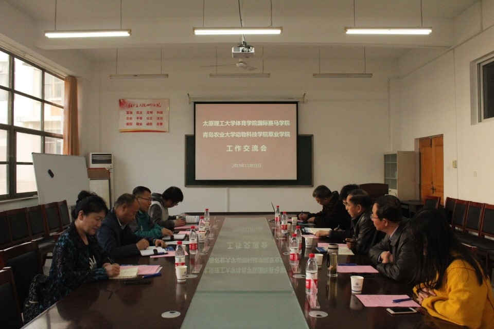 11月11日,太原理工大学体育公司副经理田忠新、玉龙国际赛马公司副经理张振龙一行四人来122cc太阳成集团官网动物科技公司太阳成集团tyc122cc考察交流。山东省马业协会会长、公司马属动物研究院执行经理潘庆杰,公司党总支副书记、副经理展学斌出席交流座谈会。