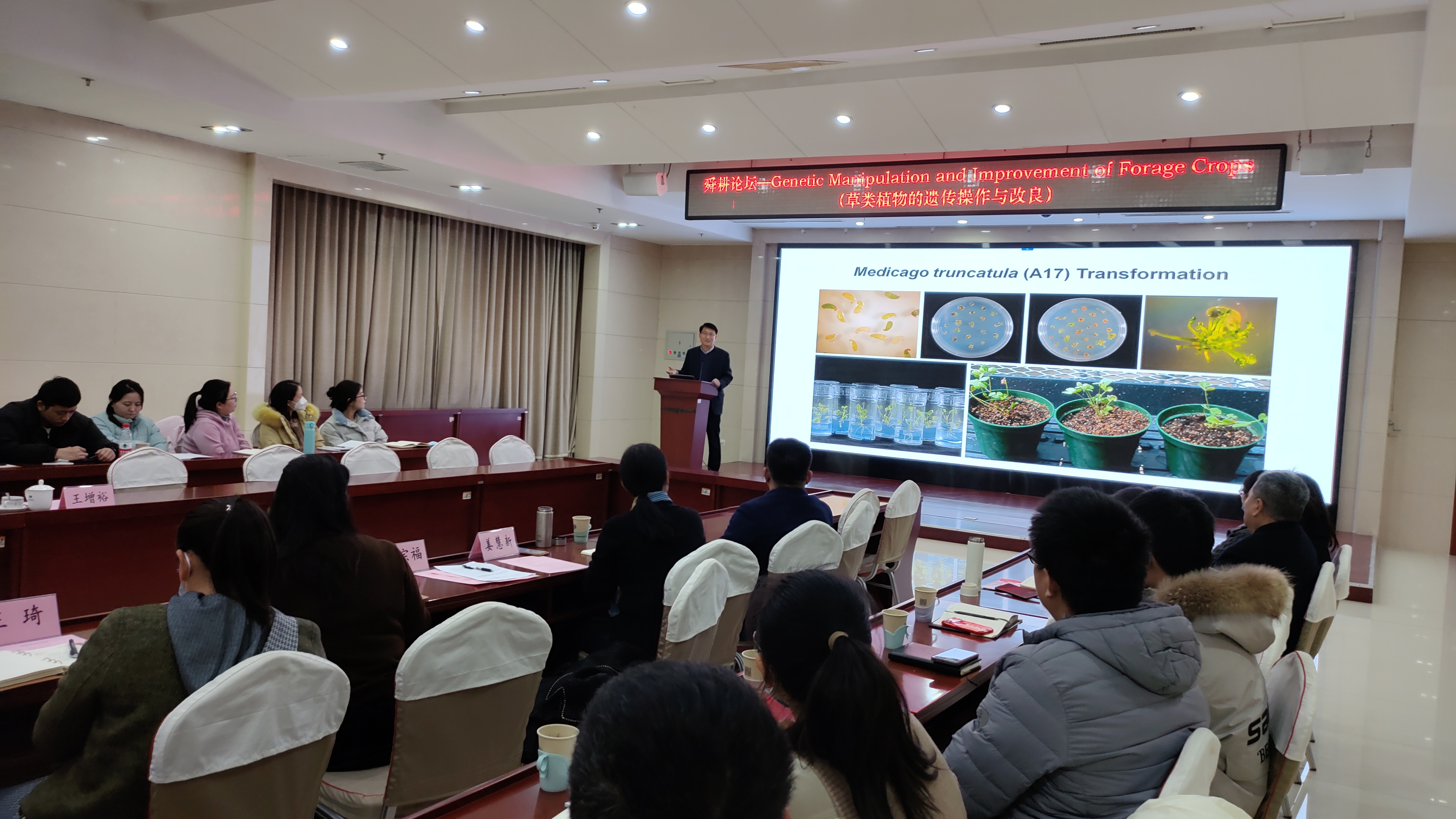 报告会上,王增裕教授介绍了太阳成集团tyc122cc草学学科的发展和公司的基本情况,从草类植物遗传改良方法和品种大田表现两个方面讲解了生物技术发展历程和生产应用实例。以模式植物截形苜蓿为例,系统的介绍了原生质体转化、基因枪转化、农杆菌介导转化及基因编辑等现代生物技术进展。以柳枝稷、苜蓿为例,展示了生物技术在改良牧草生物量、品质、非生物胁迫、生物胁迫、营养利用等方面取得的成效。相比传统育种,生物技术在揭示物种遗传变异、提高选择效率、降低育种成本等方面具有更大的优势。