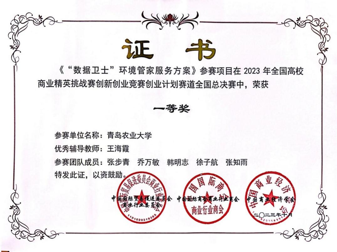 16.“数据卫士”环境管家服务方案获2023年全国高校商业精英挑战赛创新创业竞赛创业计划一等奖