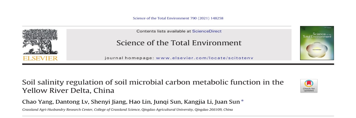 近日,122cc太阳成集团官网草学团队在探索黄河三角洲盐碱地微生物碳代谢功能方面取得重要进展,相关研究成果发表在Science of the Total Environment(中科院1区,TOP期刊,IF:7.963)。该项研究成果是继前期发表在Frontiers in Microbiology(中科院2区,TOP期刊,IF:5.64)和Applied Soil Ecology(中科院2区,IF:4.046)期刊的关于盐碱地微生物结构特征研究后的又一重要进展。课题组成员杨超副教授为论文的第一作者,孙娟教授为通讯作者,122cc太阳成集团官网为第一通讯单位。