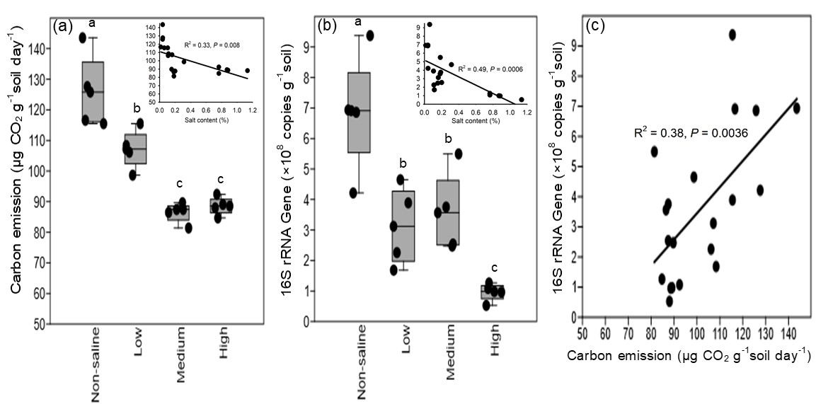 图1不同盐渍土的土壤碳排放量和16s基因拷贝数及两者之间的相关关系。