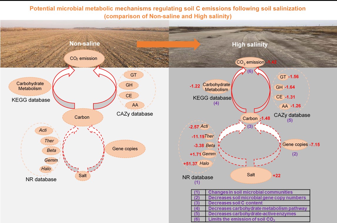 图2土壤盐渍化后调节土壤碳排放的潜在微生物代谢机制(非盐和高盐的比较)。