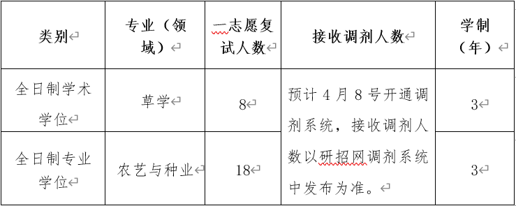 3.调入专业与第一志愿报考专业相同或相近,应在同一学科门类范围内。草学专业调剂范围限第一志愿报考专业为:草学(0909)、作物学(0901)、园艺学(0902)、农业资源与环境(0903)、植物保护(0904)、畜牧学(0905)、兽医学(0906)、林学(0907)。