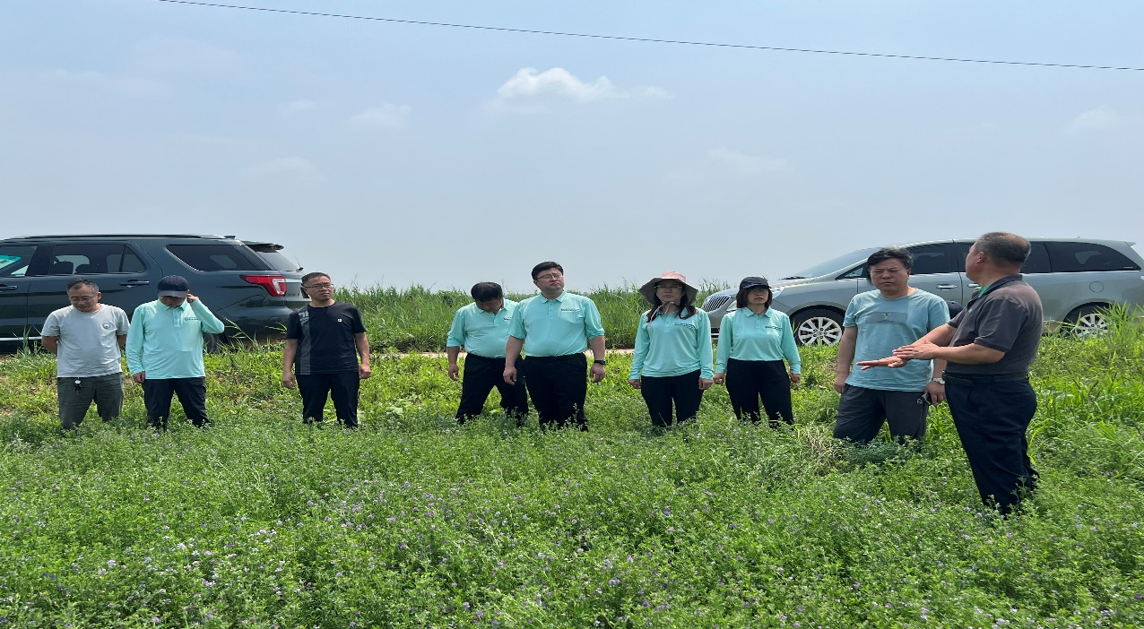 为深入推进服务黄河重大国家战略,结合黄河三角洲草地资源与生态国家林业和草原局重点实验室建设工作,7月21日,草业公司党总支书记乔磊一行赴山东省滨州市无棣县考察调研盐碱地牧草产业发展情况,副书记翟崑、副经理孙娟、刘洪庆教授、王海霞副教授、马利超博士、陶奇波博士陪同。无棣县政协党组书记、主席张恩传,海丰街道党工委书记徐文国,县畜牧兽医管理服务中心党组书记李世辉,山东绿风农业集团有限公司总经理崔立华等参加活动。