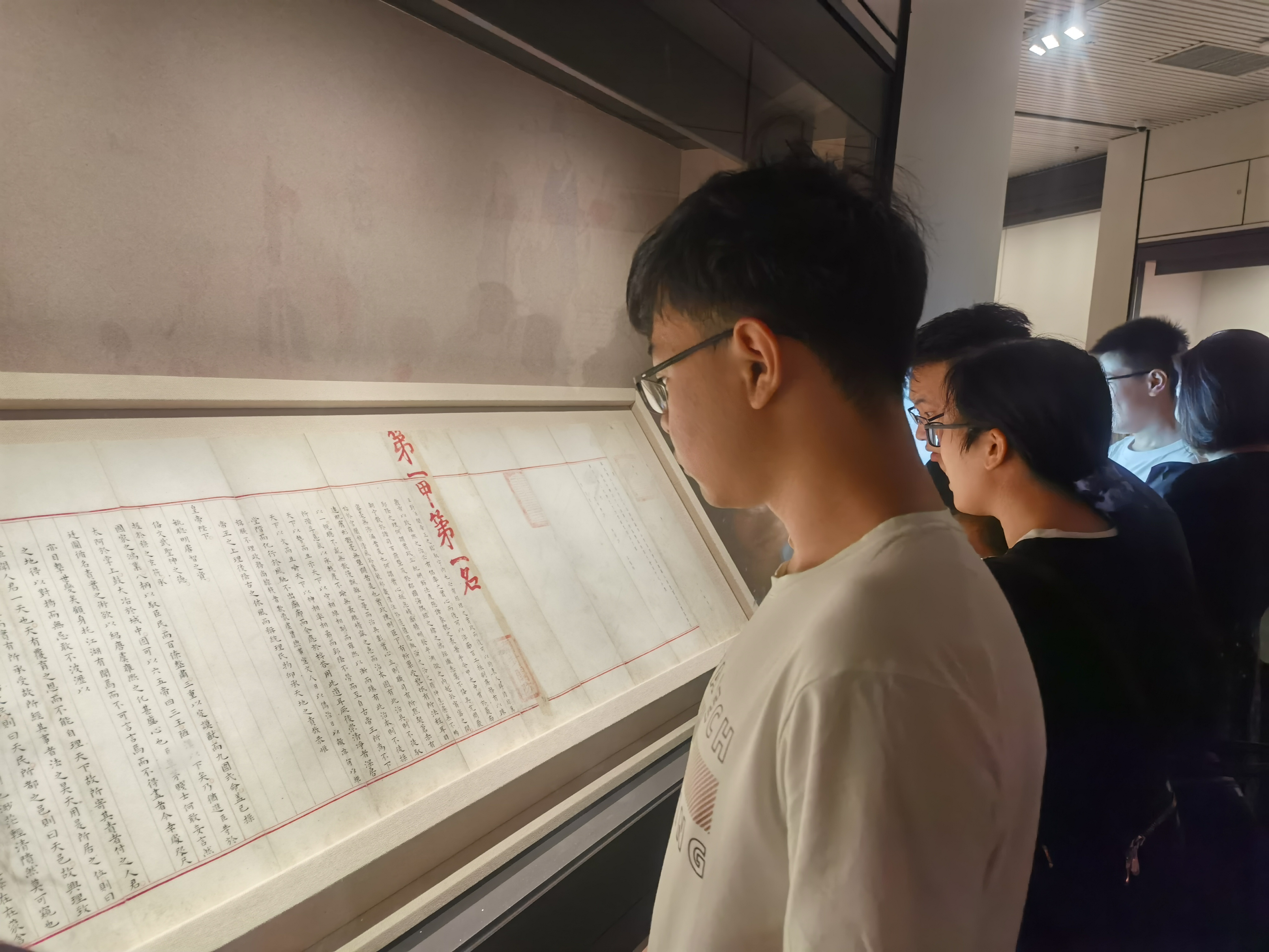 暑期活动期间正值青州博物馆新馆启用,团队成员饶有兴趣地参观了青州博物馆。该博物馆为首批全国县级唯一评定的“国家一级博物馆”,馆藏丰富,拥有五万件馆藏文物,三千件珍贵文物,百余件一级文物,这些文物无不记载着青州的悠久历史,见证着古青州的厚重与久远。其中以明赵秉忠状元卷最为出名,该状元卷为状元赵秉忠的殿试答卷,是中国大陆唯一的殿试状元卷真迹。馆藏的东汉“宜子孙”玉璧和战国玉人是罕见的玉器珍品;龙兴寺遗址窖藏出土的 400 余尊佛教造像,是中国古代雕塑艺术的杰出代表。