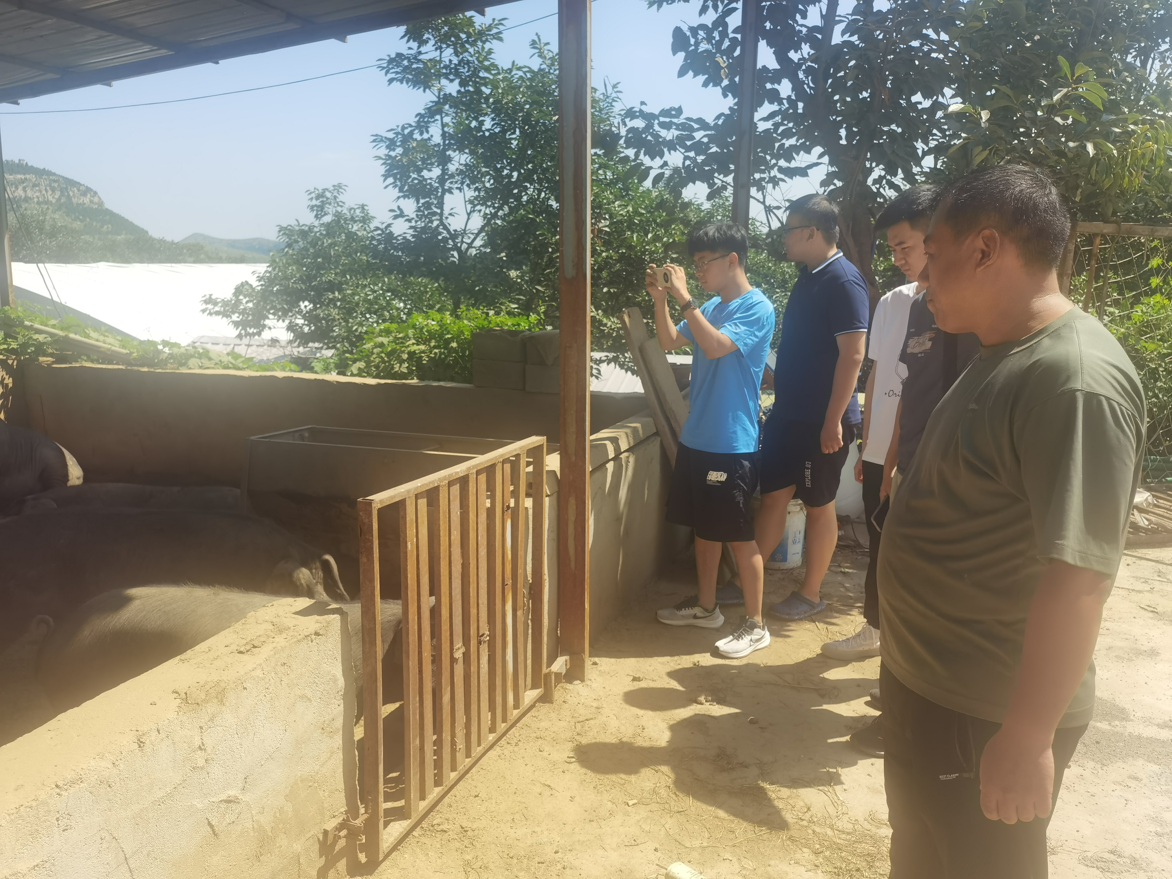 团队成员详细听取企业负责人讲解黑猪养殖技术。在饲料的选取上采用玉米、谷糠、小麦等天然作物制作而成的饲料,还原生猪原始食物来源。养殖区域以山地为主,远离城市,周边环境污染小,为生猪生长提供原生态生活环境。但同时也了解到由于运输成本较高,牲畜生长周期较长等原因导致生产成本居高不下,出现产品销量较低的问题。团队成员结合市场规律,针对性的提出通过互联网等手段,瞄准北上广等高消费群体提供高品质高价值畜牧产品等意见建议。