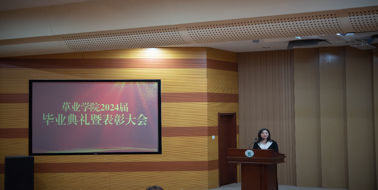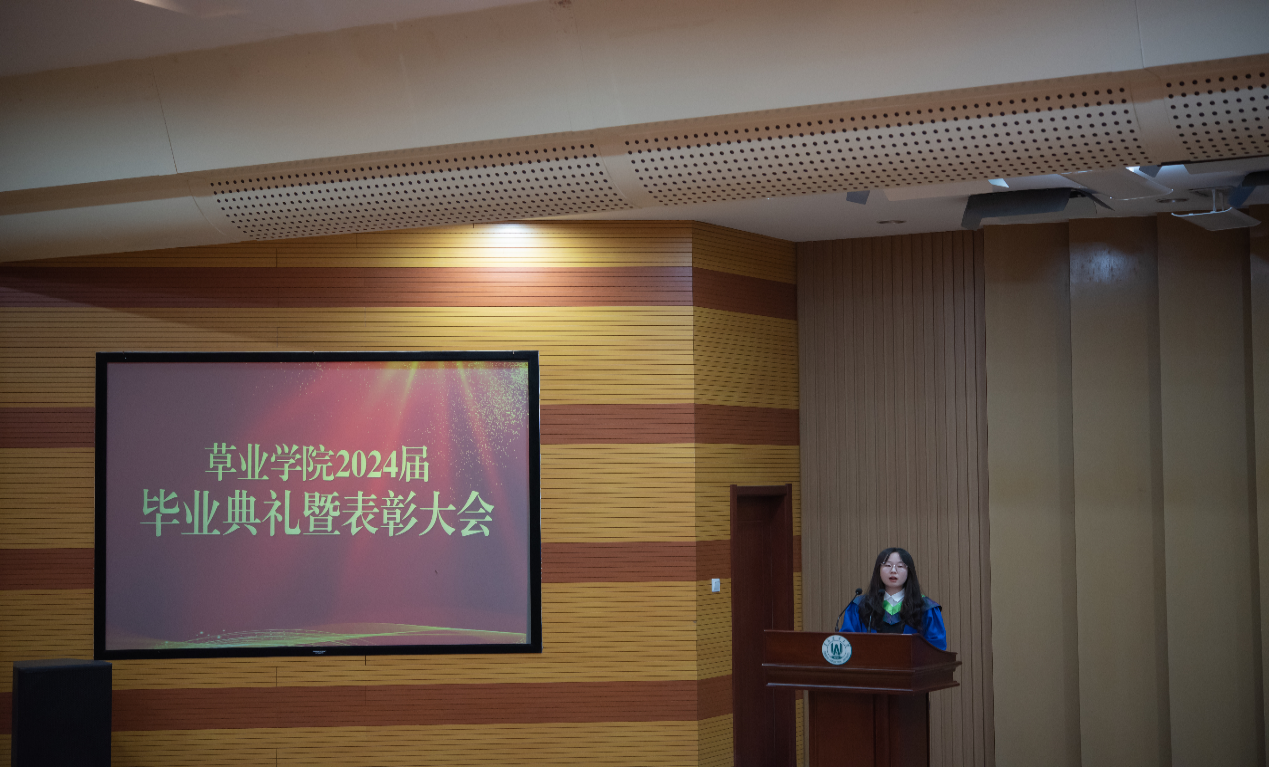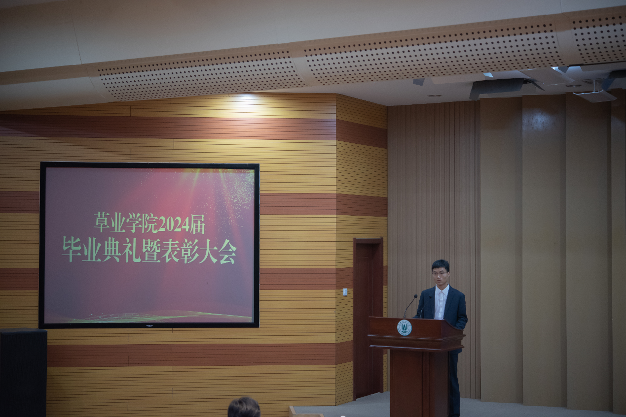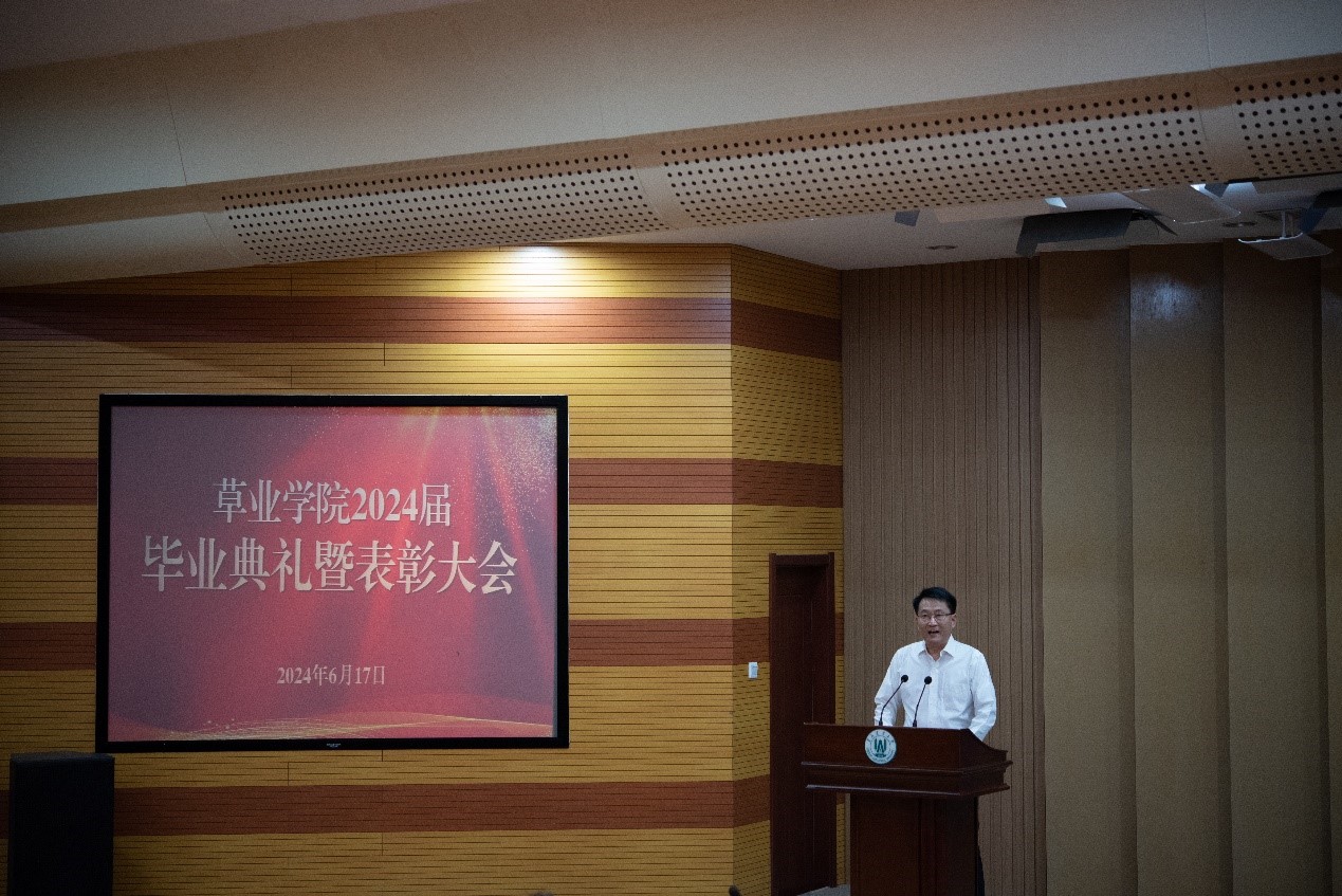 经理王增裕致辞,代表公司向2024届毕业生表示祝贺,鼓励同学们秉承“发展草业科学、创新三农实践”的院训,在国家战略的指引下,做奋斗者,做追梦人,为生态文明建设和全国草牧业高质量发展贡献青岛农大草业力量。同时对同学们提出三点希望期望,一是坚守初心,行稳致远。向身边的榜样学习,在追求卓越的道路上不畏艰难,不断超越自我,勇攀高峰;二是努力拼搏,不负韶华。坚持学习新知识,努力开拓新技术,勇于创新新方法,不断提升自己的专业素养和学习能力;三是心怀感恩,善于回馈。要孝敬父母、善待同事,尽自己的力量帮助他人,以感恩之心回馈社会。