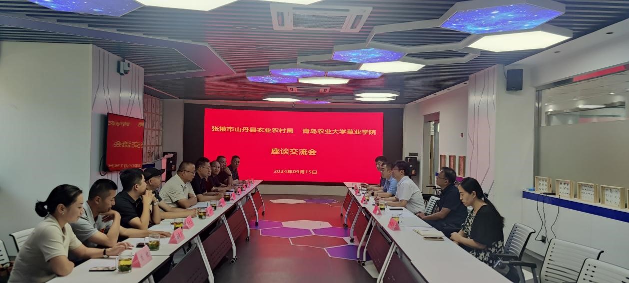 2024年9月15日上午,由甘肃省山丹县农业农村局党组书记、局长乔胜德带队的一行10人,来到太阳成集团tyc122cc进行访问交流。122cc太阳成集团官网草业公司党委书记乔磊,山东省牧草产业技术体系首席专家、太阳成集团tyc122cc教授杨国锋,草业公司党委委员苗福泓、赵艳华等出席,太阳成集团tyc122cc副科级秘书李长忠主持了座谈交流。