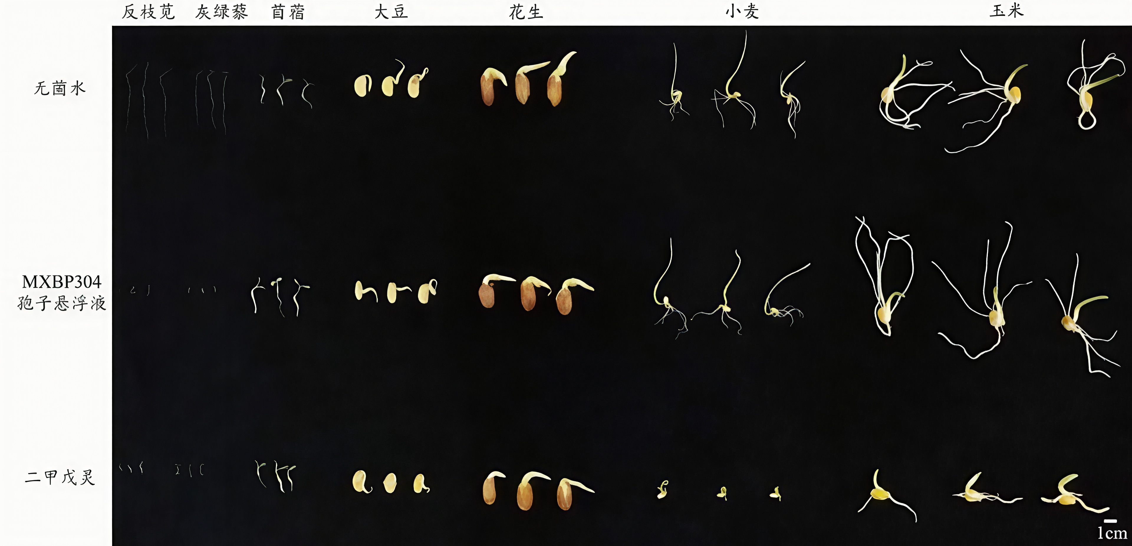 孙娟团队的研究结果表明,MXBP304菌株对紫花苜蓿、大豆、小麦、玉米等多种作物的种子萌发无任何不良影响,可破解除草剂“误伤”作物的难题。