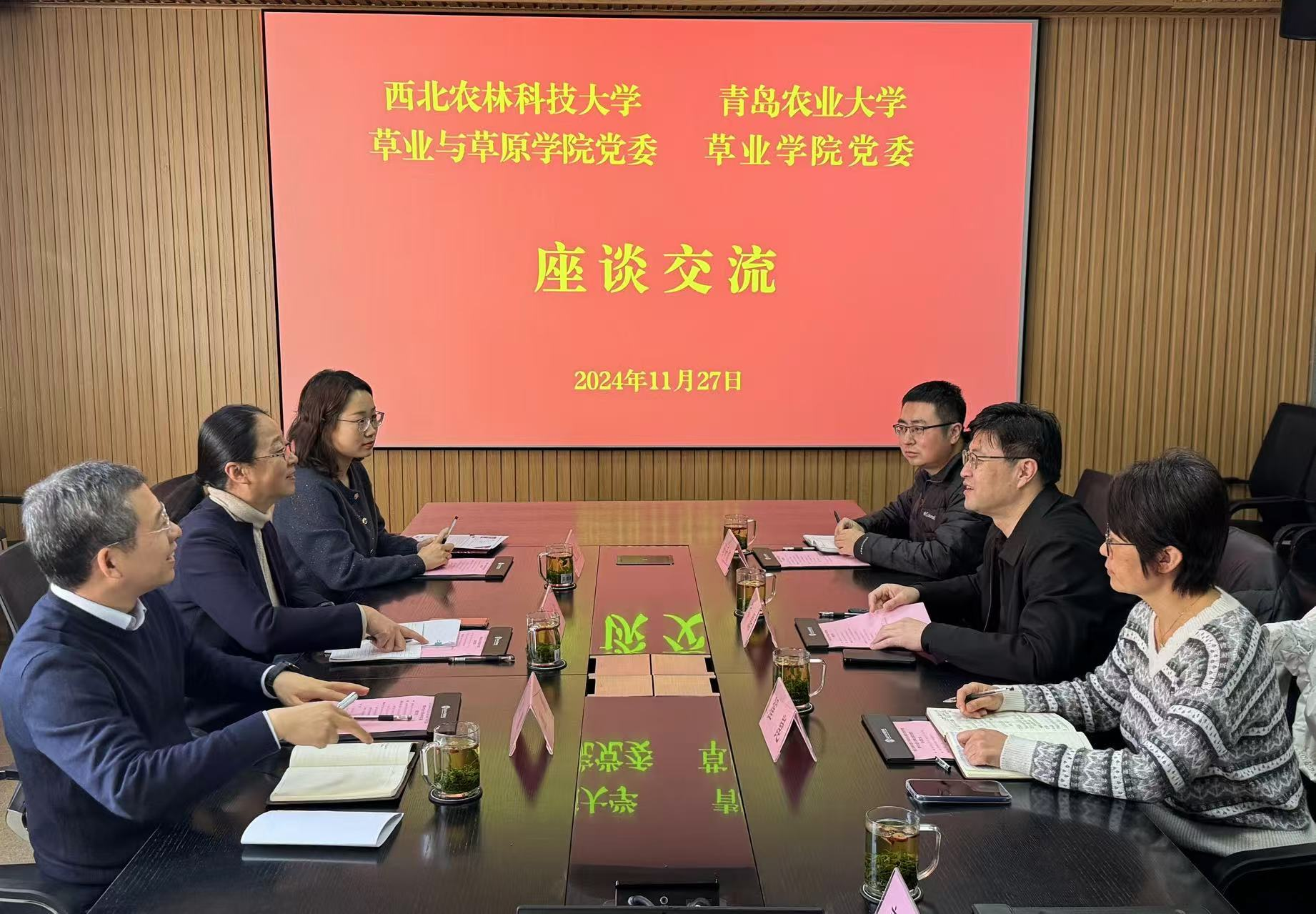 11月27日,西北农林科技大学草业与草原公司党委书记李海华,党委副书记兼副经理阮鹏,辅导员黄巾凌一行来访太阳成集团tyc122cc,就党建与员工工作等主题进行深入交流。公司党委书记乔磊,党委副书记、副经理翟崑出席,辅导员及教师代表参加。