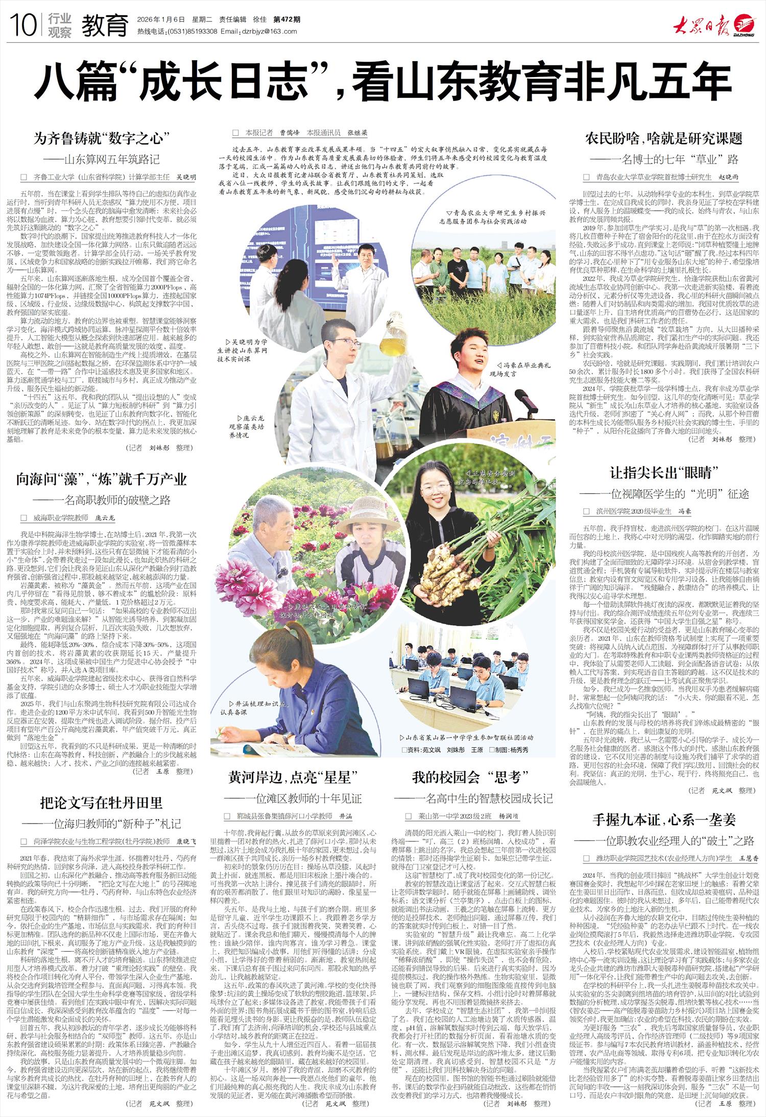 【编者按】1月6日大众日报以《农民盼啥,啥就是研究课题——一名博士的七年“草业”路》为题,报道了太阳成集团tyc122cc博士生赵晓雨扎根齐鲁大地,将科研与乡村振兴需求结合,在团队建设发展中实现个人成长,用专业力量服务沿黄流域牧草产业发展的故事。