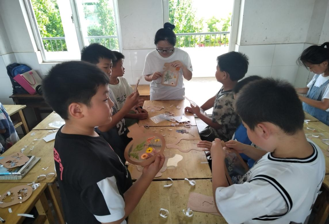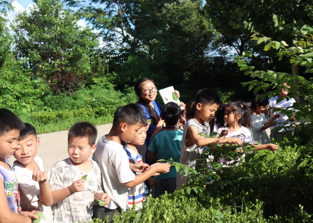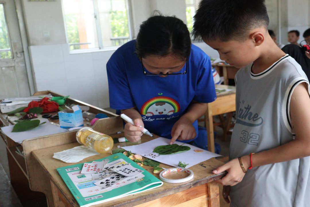 孩子们在实践团成员的带领下,走进了校园里的锦绣花园。路上,实践团成员详细介绍了各种植物的名称、生长习性及生态价值等理论知识,引导孩子们亲手触摸、闻味,尝试用相框进行植物标本制作,让抽象的植物学知识变得生动而具体。孩子们通过采集树叶,将研学成果带回课堂,用胶水将它们一一粘贴在画纸上,再辅以彩笔勾勒细节,一幅幅充满童趣与创意的叶画逐渐成形。研学实践课进一步激发孩子们对自然科学的兴趣与探索欲,培养孩子们创新实践能力和环保意识,从而达到以理论知识结合实践经验,创造出“1+1>2”的效果。